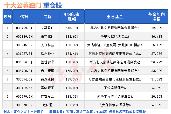 其中,艾融软件(830799.BJ)以515.73%的区间涨幅高居榜首,易方达北交所精选两年定开搀杂A基金是独一重仓该股票的公募基金产物,年内涨幅达32.90%;同期,该基金重仓的吉冈精密(836720.BJ)区间涨幅达138.83%,也参预十大公募独门重仓股榜单。